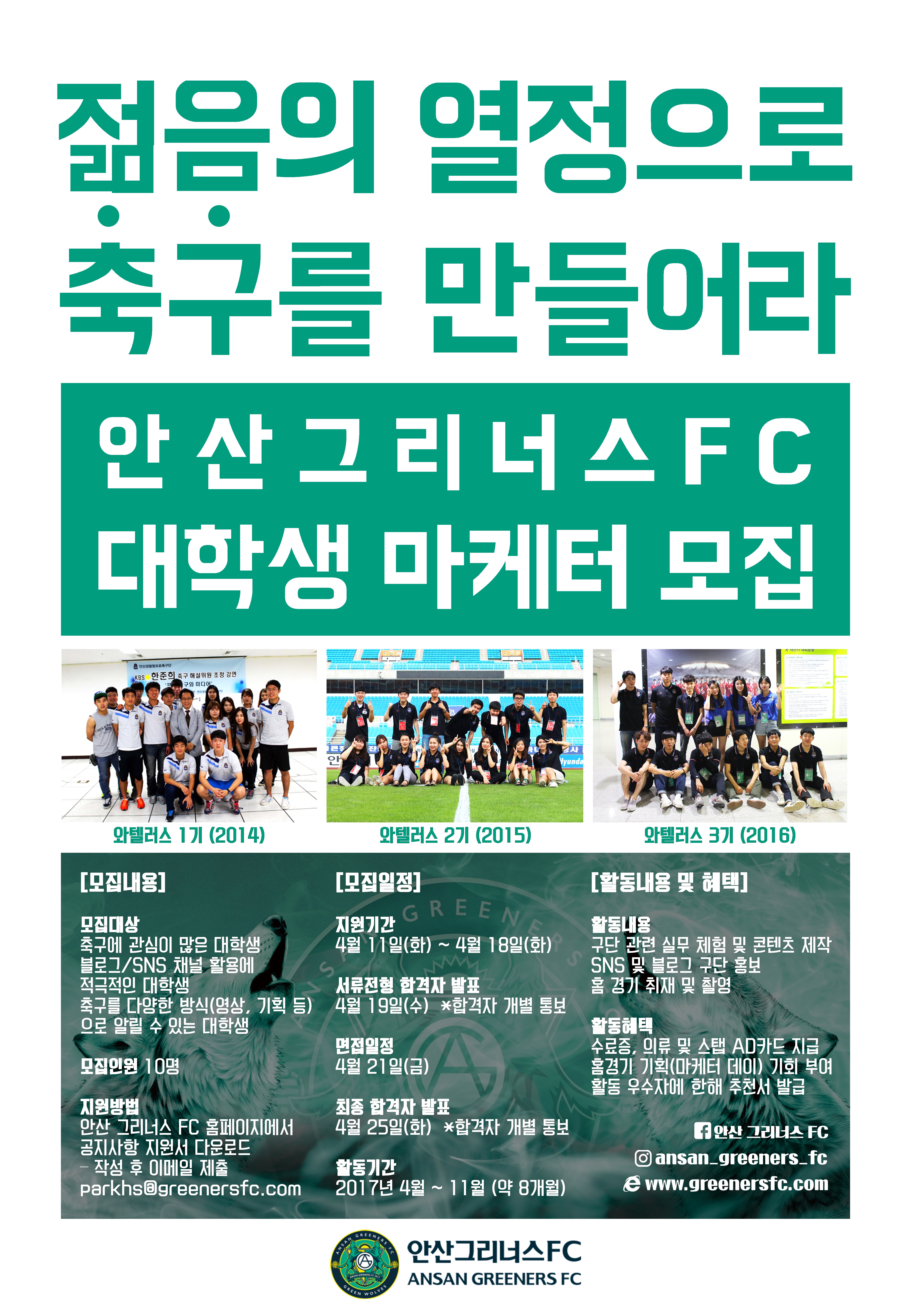 <모집 개요> 가. 대 상 : 스포츠 마케팅에 열정을 가진 남녀노소 누구나 나. 모집인원 : 10명 (사진, 영상, 디자인, 기사, 기획 등) 다. 활동기간 : 2017년 4월~11월 라. 모집일정 - 서류제출 : 4월 11일(화) ~ 4월 18일(화) *지원서 다운로드 작성 후 이메일 제출 : parkhs@greenersfc.com - 서류 합격자 발표 : 4월 19일(수) * 합격자 개별통보 - 면접 : 4월 21일(금) - 최종 합격자 발표 : 4월 25일(화) * 합격자 개별통보