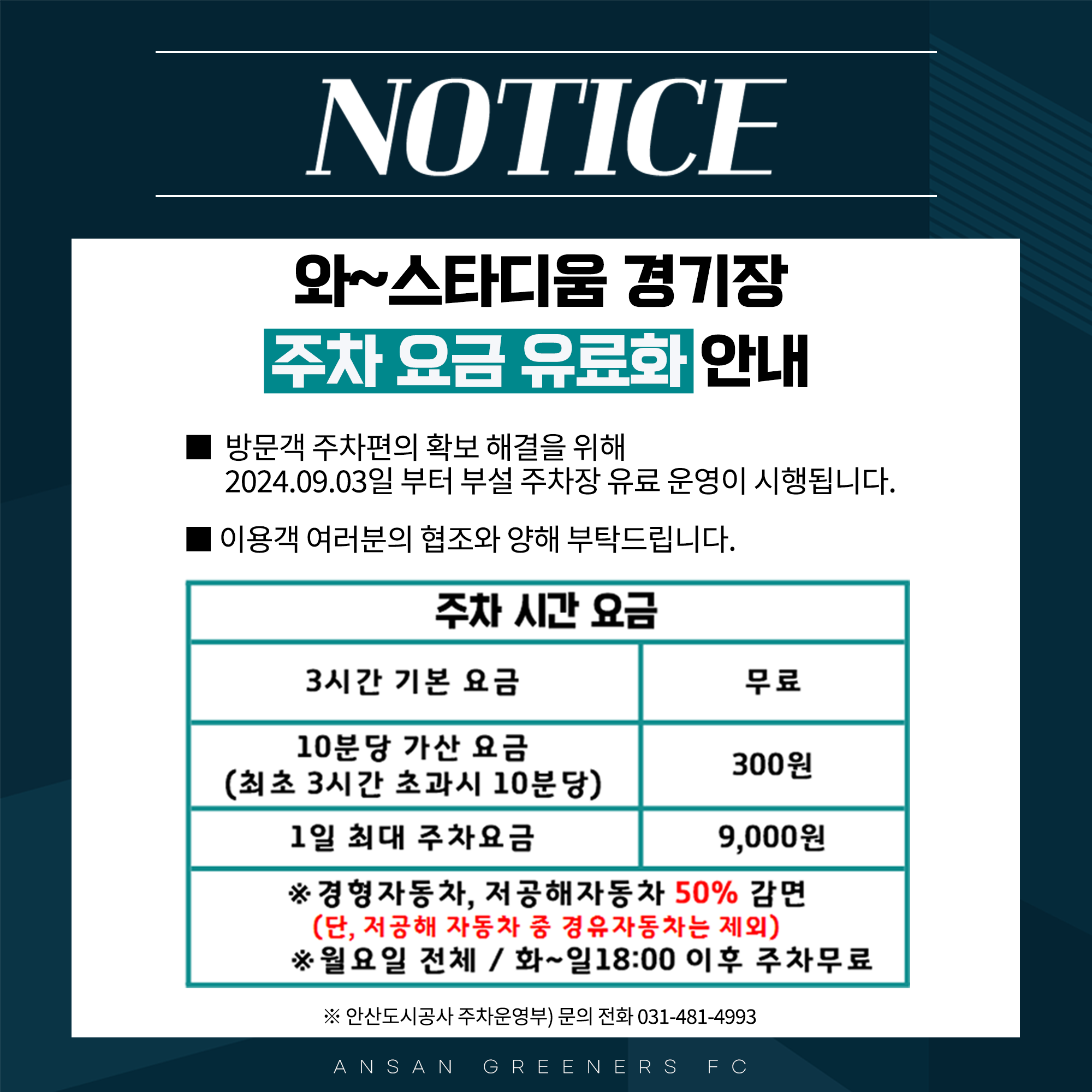 [와~스타디움 주차 요금 유료화 안내]