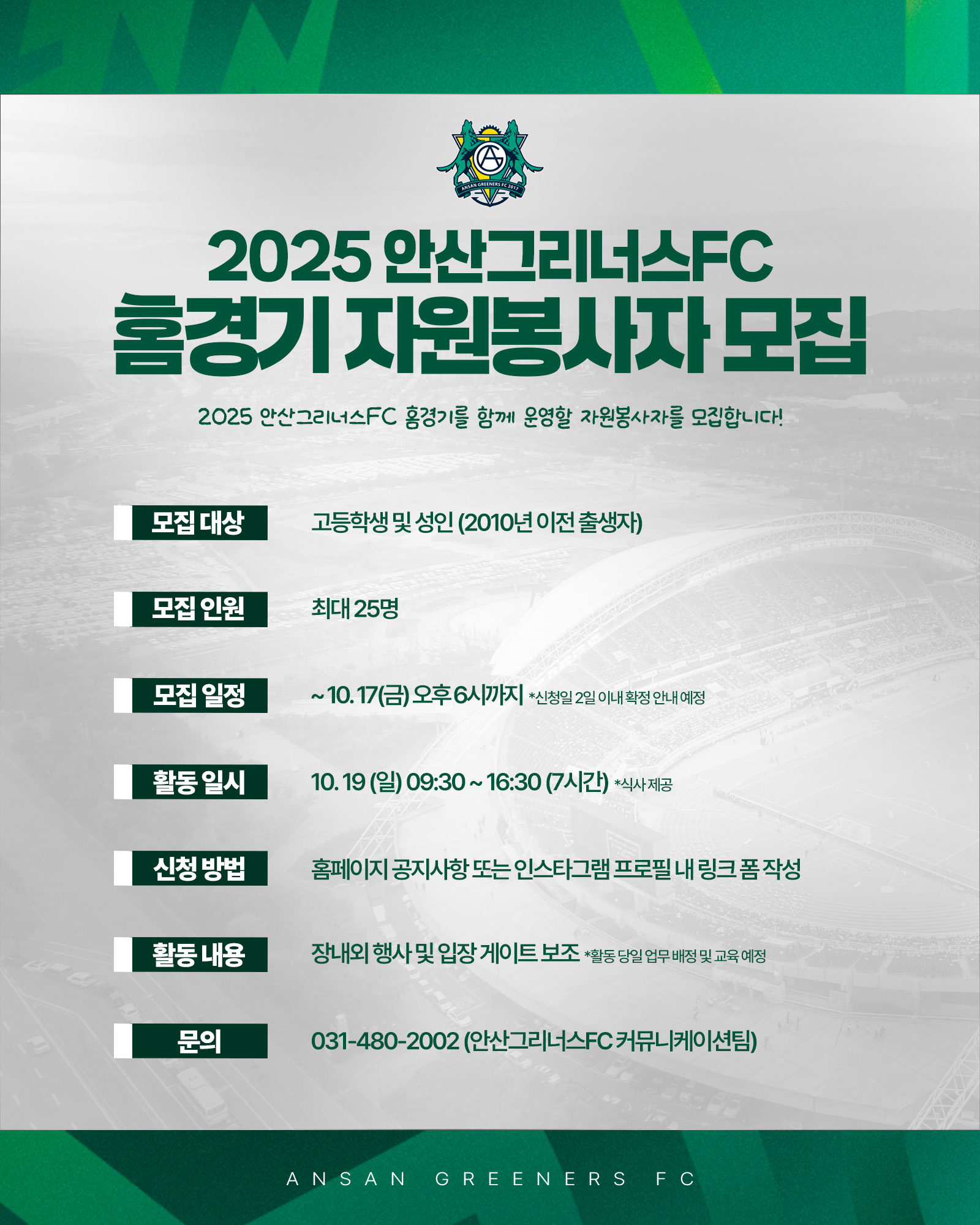 □ 모집 대상 : 고등학생 및 성인 (2010년 이전 출생자) □ 모집 인원 : 최대 25명 □ 모집 일정 : ~ 10. 17(금) 오후 6시까지 *신청일 2일 이내 확정 안내 예정 □ 활동 일시 : 10. 19 (일) 09:30 ~ 16:30 (7시간) *식사 제공 □ 신청 방법 : 네이버 폼 작성 (https://naver.me/xDCmjTFA) □ 활동 내용 : 장내외 행사 및 입장 게이트 보조 *활동 당일 업무 배정 및 교육 예정 □ 문의 : 031-480-2002 (안산그리너스FC 커뮤니케이션팀)