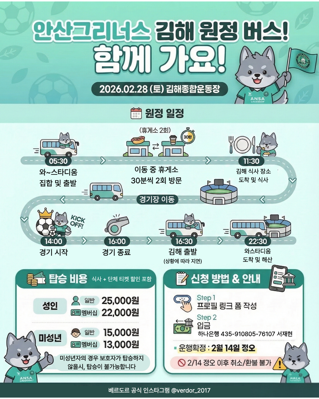 ![]() 안산그리너스 김해 원정 버스 탑승자 모집! 2026시즌, 김해 원정 떠나시는 팬 여러분들을 위해 원정 버스를 운행합니다! 먼 거리, 운전 걱정 없이 다 같이 편하게 이동하고 응원에만 집중하세요! - 일시: 2026. 02. 28 (토) - 장소: 김해종합운동장 - 출발: 와~스타디움 05:30 집합 및 출발 - 일정: 휴게소 2회 경유 / 점심 식사 제공 / 22:30 와~스타디움 복귀 예정 - 탑승 비용 (식사 + 단체 티켓 할인 포함) 성인: 일반 25,000원 / 멤버십 22,000원 미성년: 일반 15,000원 / 멤버십 13,000원 (미성년자는 보호자 미동반 시 탑승 불가) - 신청 방법 신청 폼 작성 후 입금(https://form.naver.com/response/P-HAqJbChNPl2xNb05T7pw) 입금 확인 후 신청이 완료됩니다. 입금계좌: 하나은행 435-910805-76107 서재현 - 유의사항 운행 확정 및 마감: 2/15 (일) 정오 2/15 정오 이후에는 취소 및 환불이 불가능하니 신중하게 신청 부탁드립니다. 함께 가서 승리를 응원합시다! |