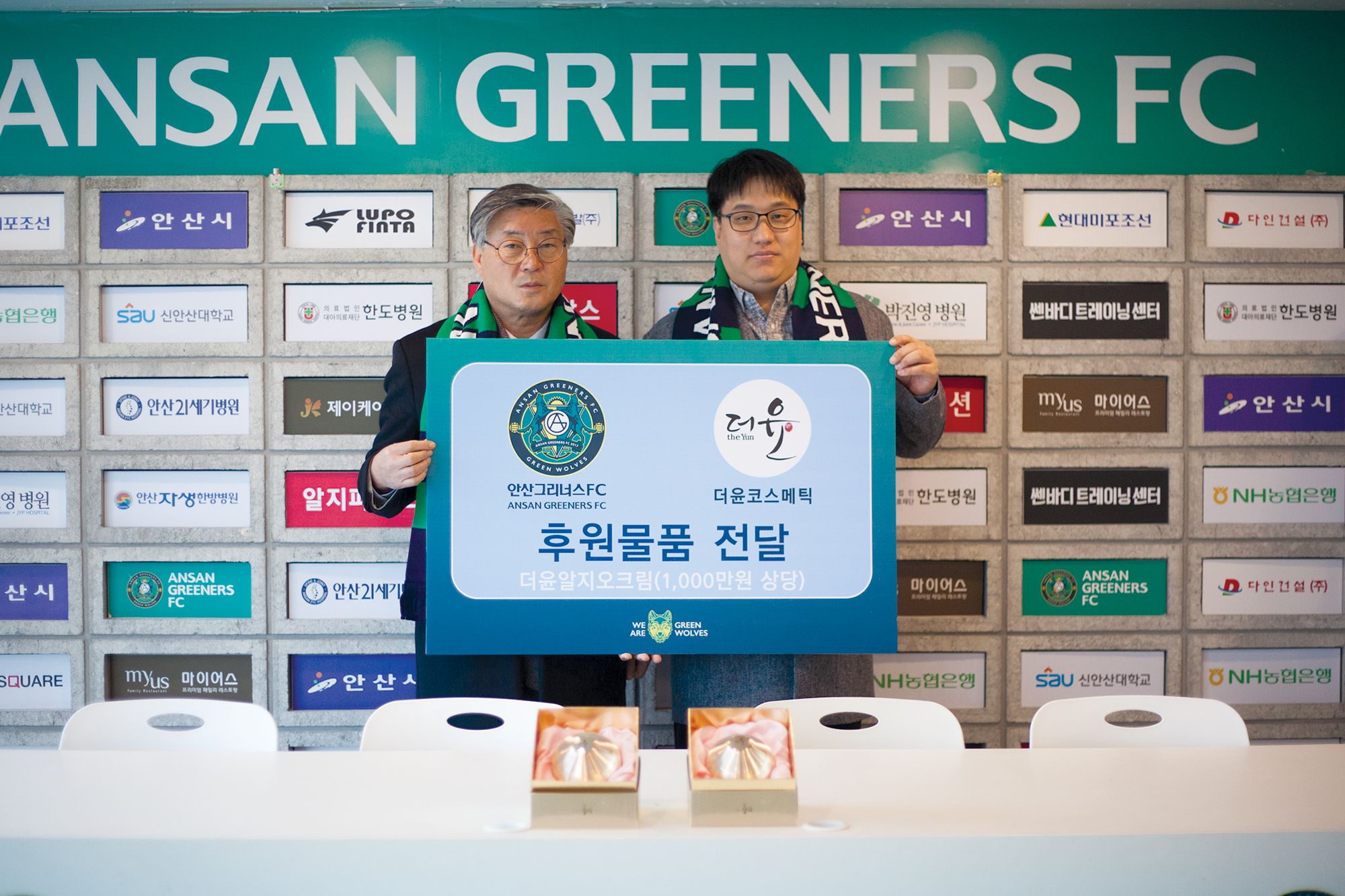 | 더윤코스메틱, 안산 그리너스에 1,000만원 상당 후원물품 전달 | |
