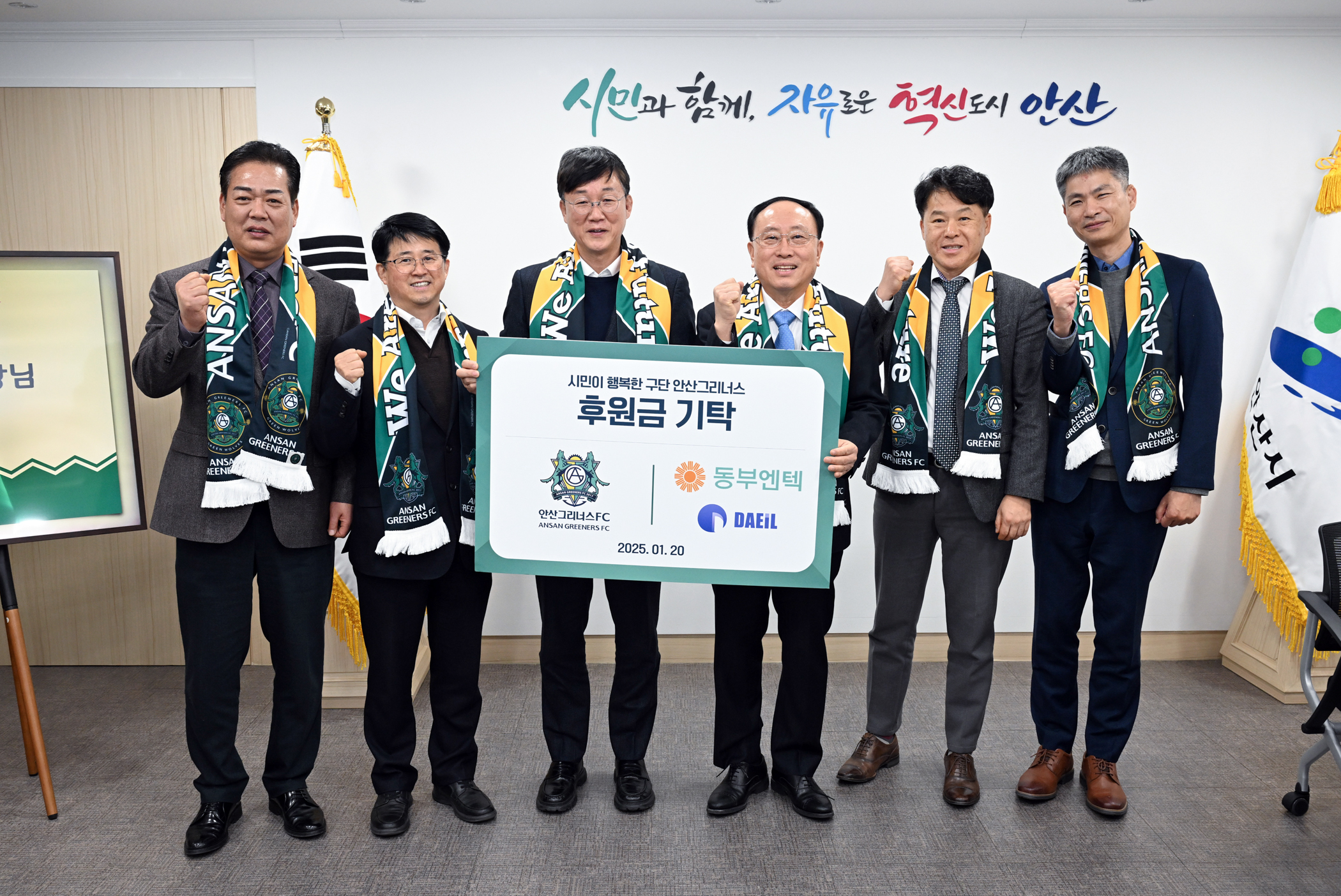 20일(월) 안산시청 시장실에서 진행된 후원금 전달식에는 안산그리너스FC 이민근 구단주, 동부엔텍 홍문기 대표이사 등이 참석해 자리를 빛냈다.