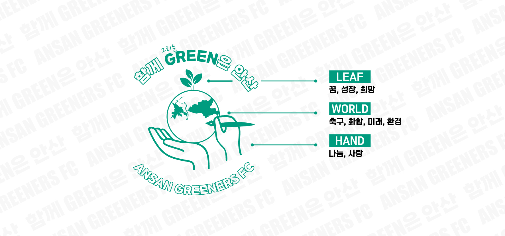 브랜드 로고는 손, 지구, 새싹을 주요 상징으로 구성됐다. 손은 연대와 보호, 함께 돕는 안산의 따뜻한 마음을 의미하며, 지구는 축구를 매개로 한 화합과 지속가능한 미래 가치를 표현한다. 새싹은 미래 세대의 꿈과 성장, 지역의 희망을 의미한다.