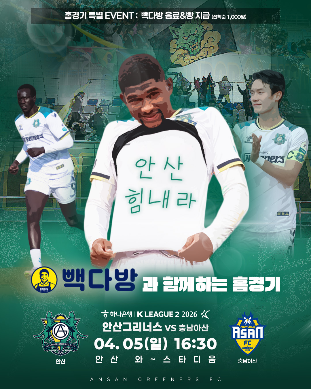 또한 차경미 씨가 운영하는 빽다방(더본코리아)의 후원으로, 경기장을 찾은 관람객 1,000명에게 음료와 빵이 제공된다. 안산의 이번 홈경기는 팬들과 함께 따뜻한 응원을 나누는 뜻깊은 자리가 될 전망이다. |
