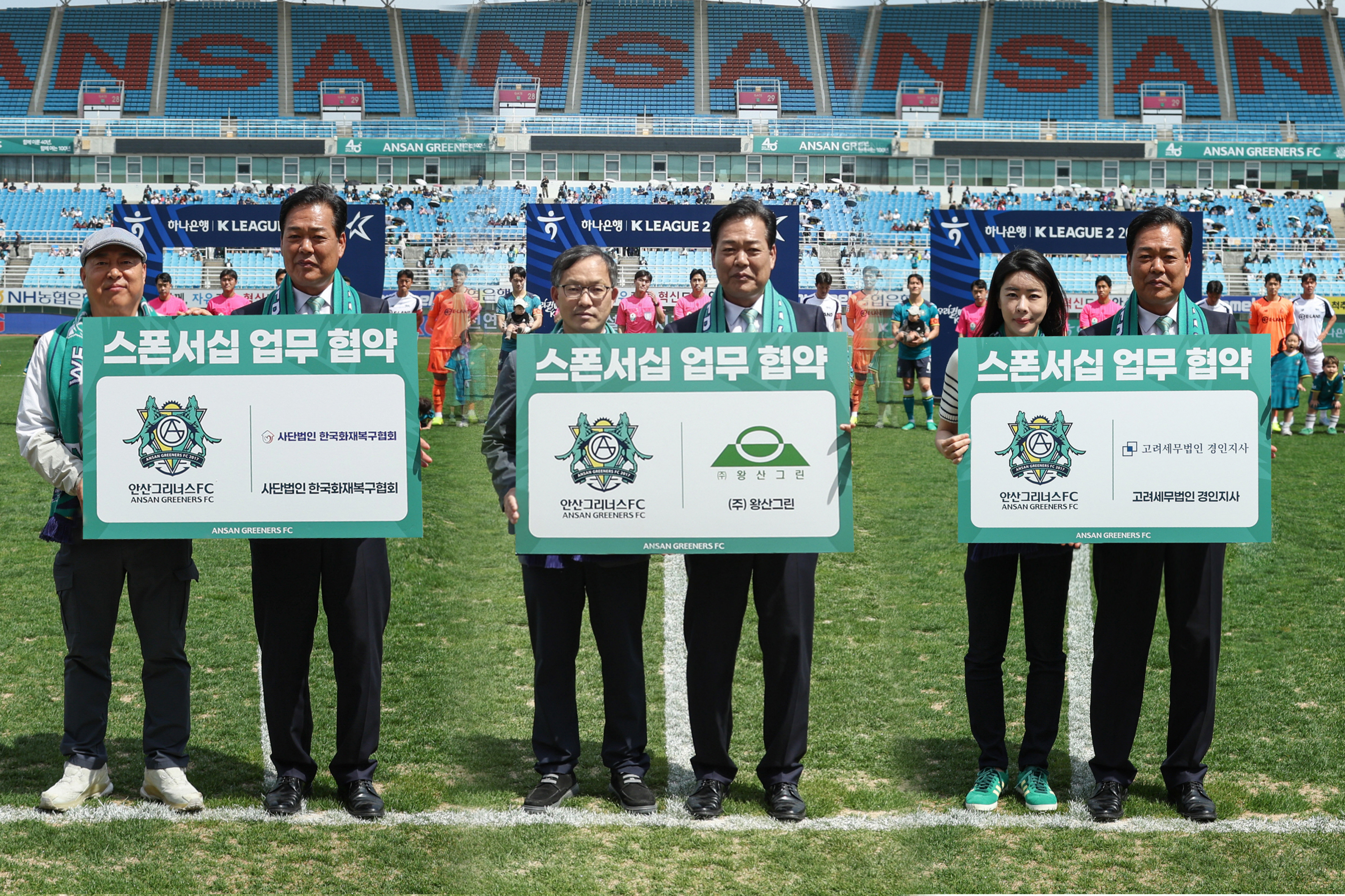 안산그리너스FC(이하 안산)가 지난 19일 고려세무법인 경인지사, 사단법인 한국화재복구협회, ㈜왕산그린과 스폰서십 업무 협약을 체결했다.