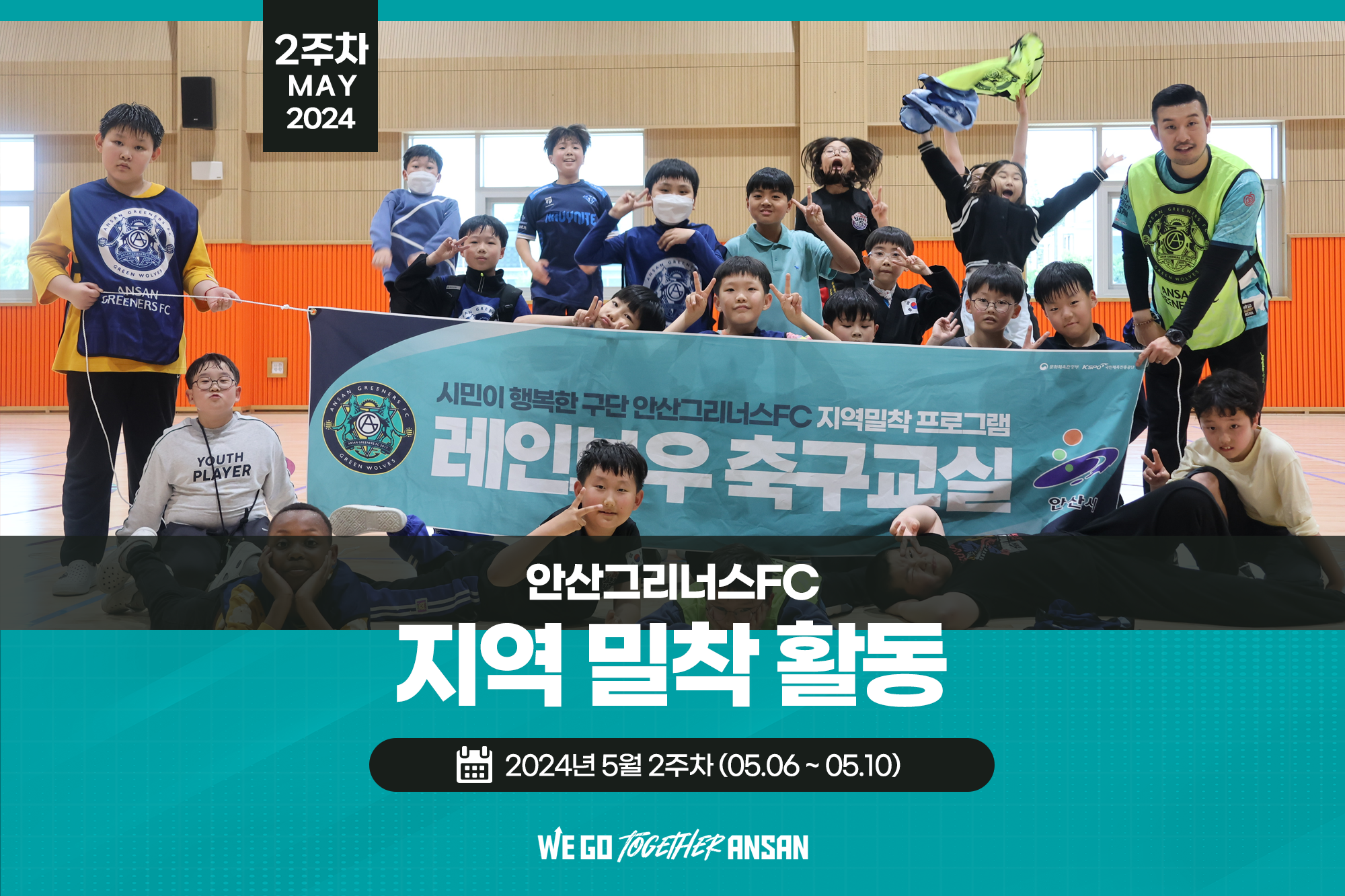 안산그리너스 5월 2주차 지역밀착 활동 ✦레인보우 축구교실 - 5월 7일(화) 14:40~15:40 - 능길초등학교 ✦그리너스 힐링체조 - 5월 8일(수) 10:00~11:30 - 고잔동행정복지센터 ✦그리너스 헬스케어 - 5월 9일(목) 10:00~11:00 - 상록장애인복지관 - 이승빈 선수, 김재성 선수 ✦그린스쿨 - 5월 10일(금) 13:50~14:30 - 석수초등학교 -김진현 선수, 김영호 선수