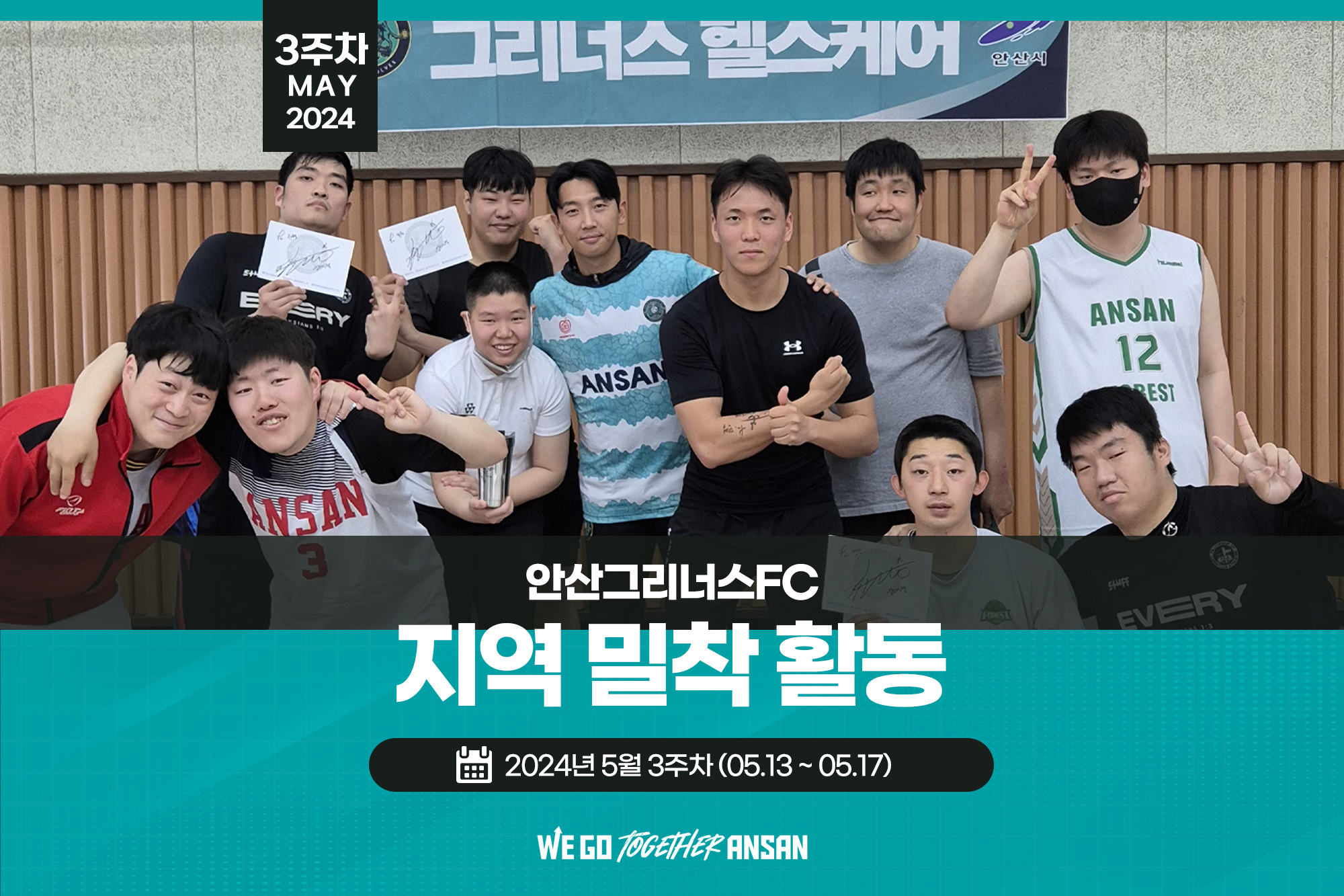 ???????????????????????????????????? 안산그리너스 5월 3주차 지역밀착 활동 ✦레인보우 축구교실 - 5월 14일(화) 14:40~15:40 - 능길초등학교 - 장유섭 선수 ✦그리너스 헬스케어 - 5월 16일(목) 10:00~11:30 - 상록장애인복지관 - 김대경 선수 ✦그린스쿨 - 5월 17일(금) 13:50~14:30 - 석수초등학교 - 이지승 선수