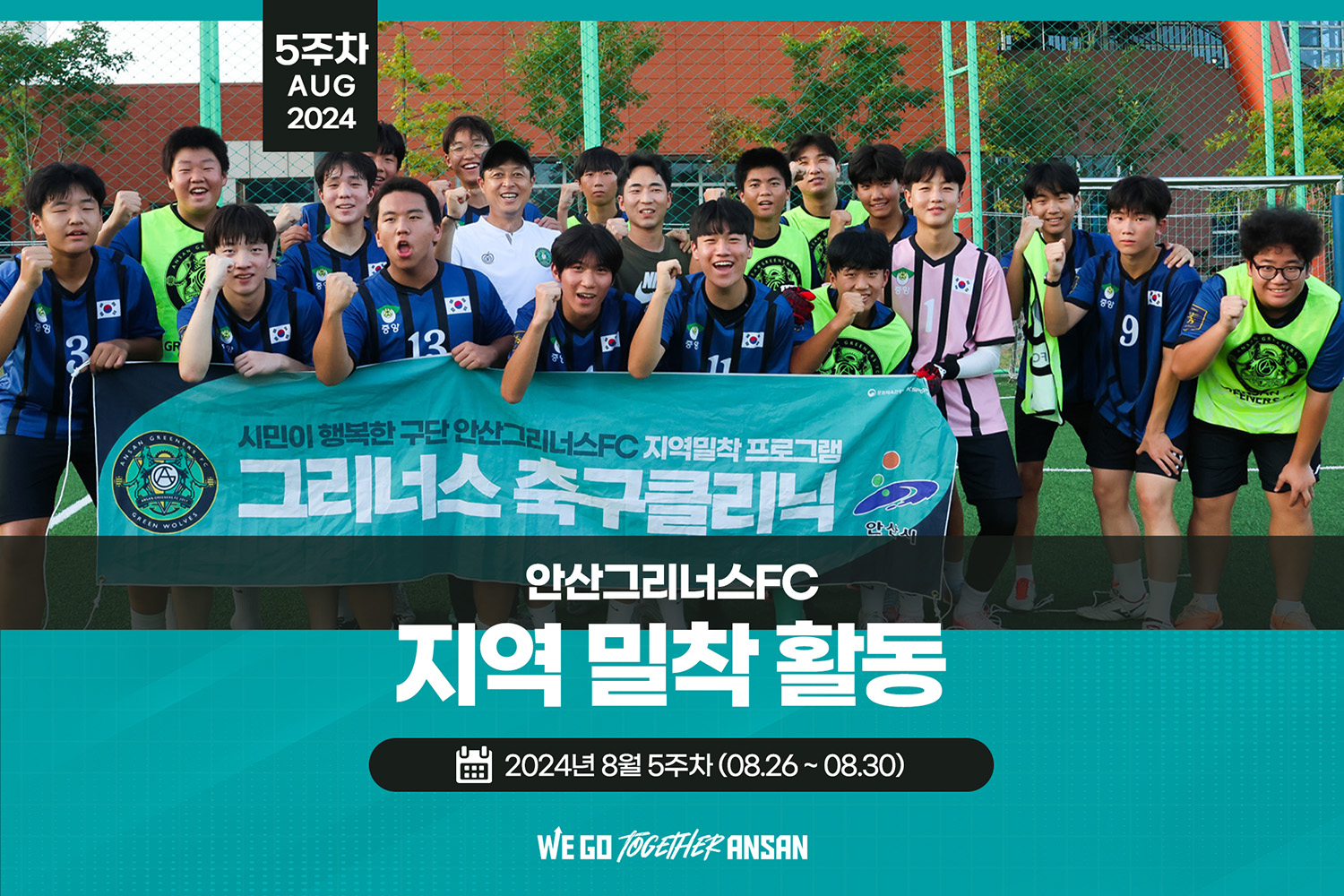 안산그리너스는 언제나 안산시민들과 함께!안산그리너스 8월 5주차 지역 밀착 활동■그리너스 힐링체조- 일시 : 8/28(수) 10:10~11:10- 장소 : 고잔동행정복지센터■그리너스 축구클리닉- 일시 : 8/28(수) 17:00~19:00- 장소 : 단원청소년수련관 체육관- 이관우 감독■그린 스쿨- 일시 : 8/29(목) 13:50~14:30- 장소 : 원일 초등학교- 김기환, 김래우 선수
