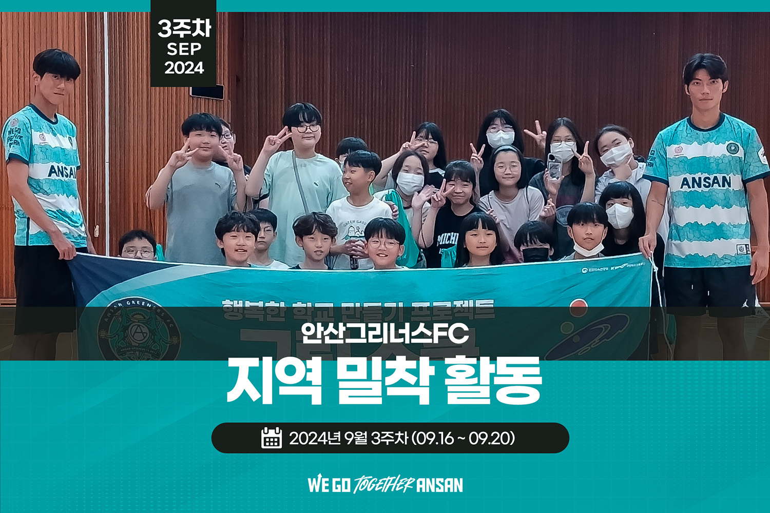 안산그리너스는 언제나 안산시민들과 함께안산그리너스 9월 2주차 지역 밀착 활동■그린 스쿨- 일시 : 9/19(목) 14:00~14:40- 장소 : 중앙초등학교 5학년 3반- 강준모, 김지한 선수