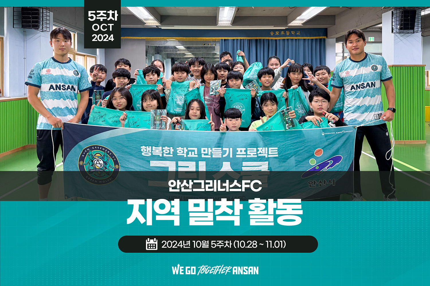 안산그리너스는 언제나 안산시민들과 함께안산그리너스 10월 5주차 지역 밀착 활동■레인보우 축구교실- 일시 : 10/29(화) 14:40~15:40- 장소 : 능길초등학교 체육관■그린스쿨- 일시 : 10/31(목) 14:00~14:40- 장소 : 중앙초등학교 체육관 (6학년 4반)- 김응열 선수■그린스쿨- 일시 : 11/1(금) 14:00~14:40- 장소 : 송호초등학교 체육관 (5학년 4반)- 이지승, 김래우 선수